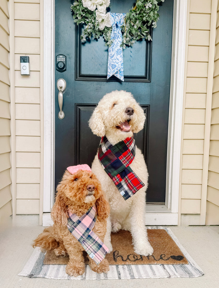 Pastel trees, bows and plaid Christmas reversible dog bandana with soft macrame cord tie closure FREE Personalization