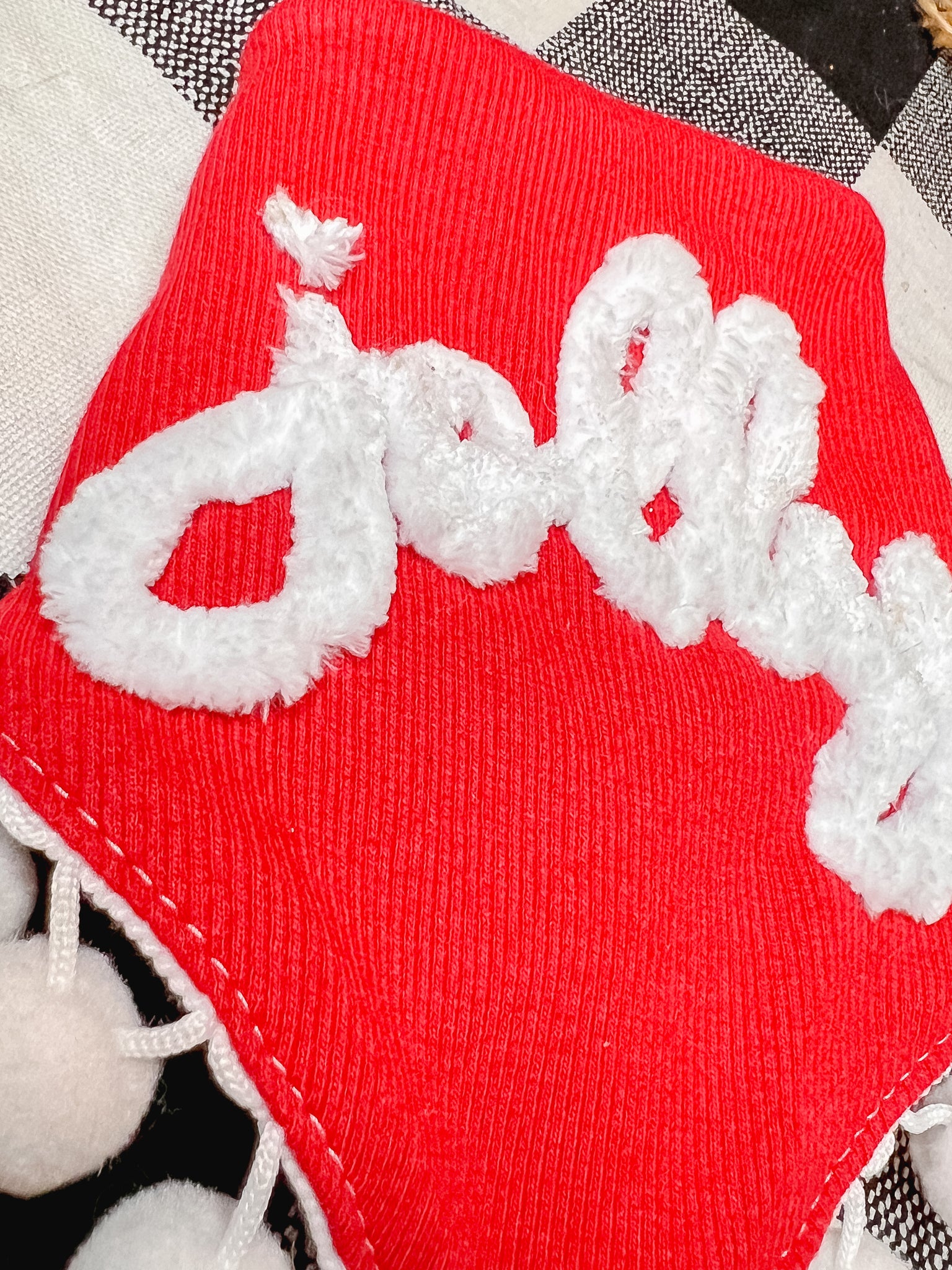 This bandana is made with red mini wale corduroy fabric. We use Chenille yarn to create the word JOLLY in white. Available with white pom trim.